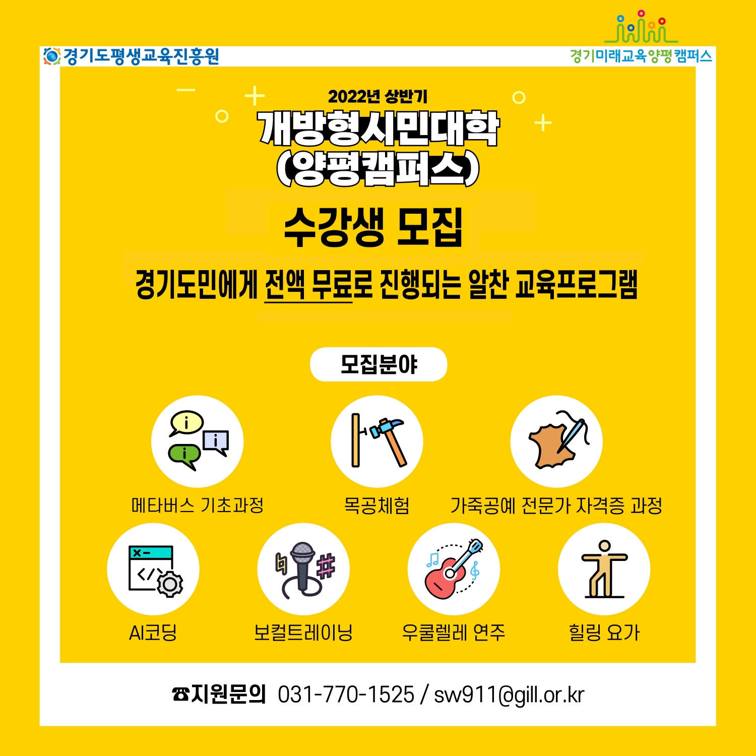 경기도평생교육진흥원 경기미래교육양평캠퍼스가 2022년 상반기 ‘개방형시민대학’ 첫 참가자 총 110명을 모집한다.