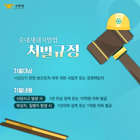 처벌 규정으로는 사망사고 발생 시 1년 이상의 징역 또는 10억원 이하의 벌금, 부상자 또는 질병자 발생 시 7년 이하의 징역 또는 1억원 이하의 벌금을 사업주 또는 경영책임자에게 부과한다.