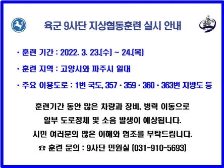 육군 9사단, 지상협동훈련 실시 -고양ㆍ파주 일대 3월 23, 24일 진행… 시민 여러분의 이해와 협조 당부