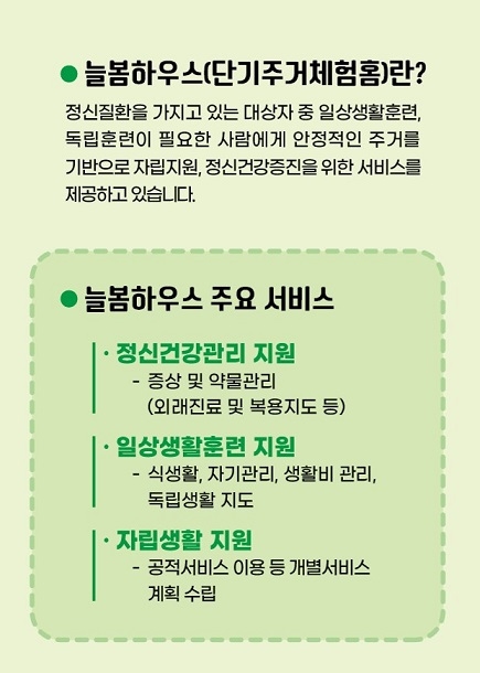 ‘늘봄하우스’는 항상 봄과 같은 따뜻한 공간이라는 의미로, 정신질환자들의 재발방지 및 자립생활능력을 향상시키기 위해 2020년 10월부터 금촌동에 위치한 빌라를 임차해 운영하는 주거지원 서비스다.