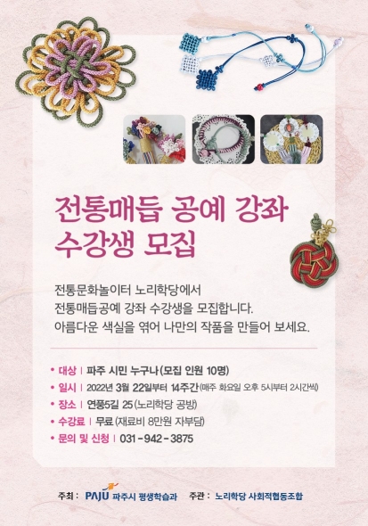 파주시는 파주시 EBS연풍길에 조성된 교육장 연풍마루에서 3월 22일부터 7월 말까지 한국 전통매듭 공예 교육을 진행한다.
