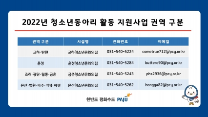 한편, 파주시는 2021년 청소년동아리 활동 지원사업을 통해 총 53개의 동아리를(초등학교 3개, 중학교 동아리 13개, 고등학교 동아리 15개, 청소년 시설 동아리 22개) 지원했고, 1기 청소년동아리연합회를 구성해 청소년문화거리 행사를 기획·운영하는 등의 성과를 보였다.