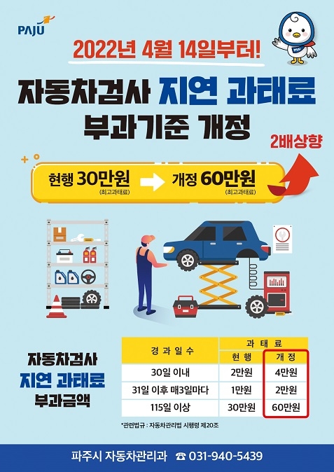 파주시, 차량소유자 과태료 발생 예방 등 안내 - 4월 14일 이후 자동차 검사지연 과태료 2배 인상