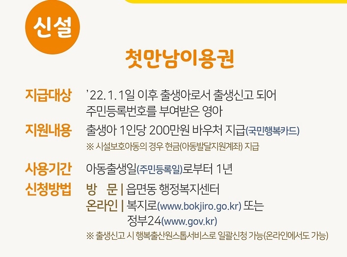 ‘첫만남 이용권’은 정부에서 올해 신규 추진하는 저출산 대책 중 하나로 2022년 1월 1일 이후 출생아 1인당 200만원의 바우처를 일시금으로 지급한다.