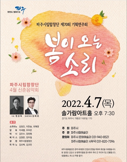 파주시는 파주시립합창단이 봄을 맞이해 오는 7일 솔가람아트홀에서 제70회 기획연주회 ‘봄이 오는 소리’ 신춘음악회를 연다고 밝혔다.