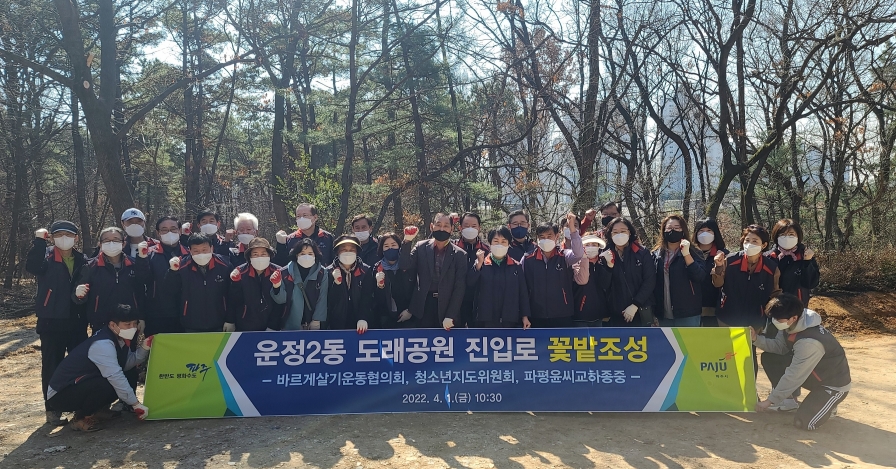 파주시 운정2동(동장 권예자)은 지난 1일, 도래공원 진입로(파주시 목동동 산 53-21) 등 3개 구역 300㎡에 철쭉, 회양목 등 5,500주의 식재를 통해 불법행위 근절을 위한 꽃밭을 조성했다고 밝혔다.