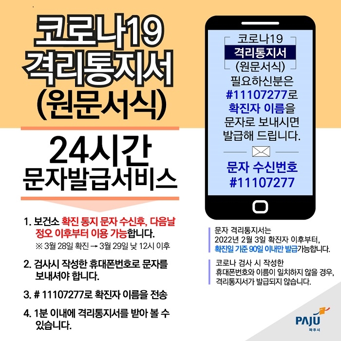 파주시, 코로나19 격리통지서(원본서식) 24시간 문자발급서비스 운영