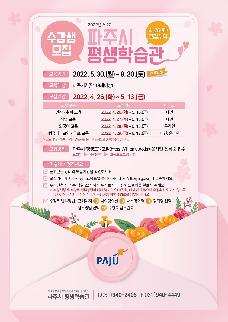 신청 자격은 만 19세 이상 파주시민이면 누구나 가능하며, 파주시 평생교육포털(lll.paju.go.kr)을 통해 모집 분야별 선착순으로 신청할 수 있다. 자세한 사항은 파주시 평생학습과 교육운영팀(☎031-940-2408)으로 문의하면 된다.