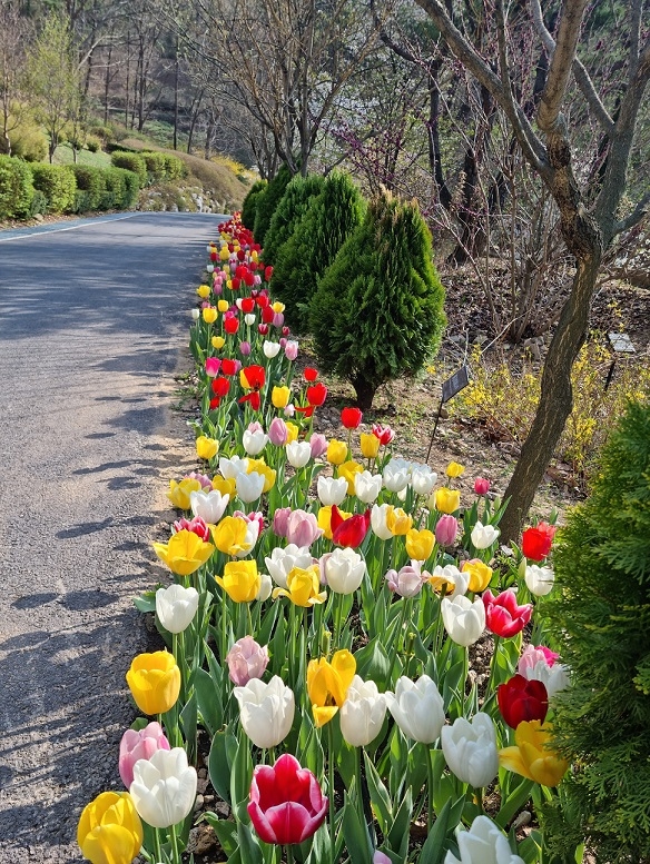 작년 겨울 율곡수목원에 식재된 튤립은 수목원 잔디광장과 길가를 따라 3월 말부터 꽃망울을 터뜨려 방문객들을 맞이하고 있다.