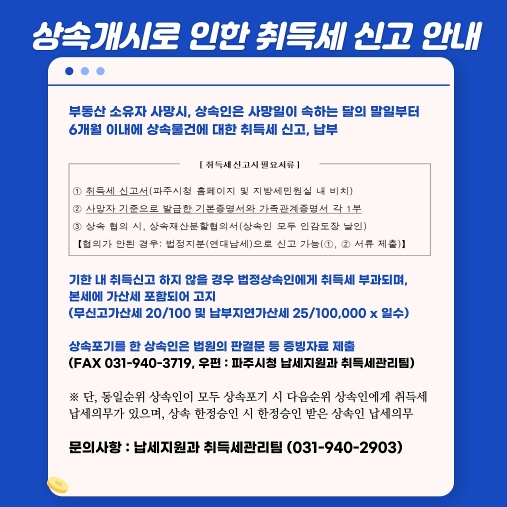 파주시, 상속 부동산 취득세 신고납부 적극 안내 - 가산세 부담 방지 차원