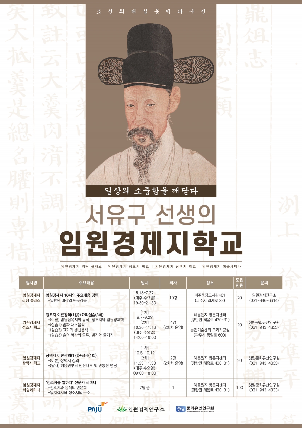 파주시, 매주 수요일‘임원경제지 학교’운영 - 5월 18일부터 11월 30일까지, 서유구 선생 만나는 날