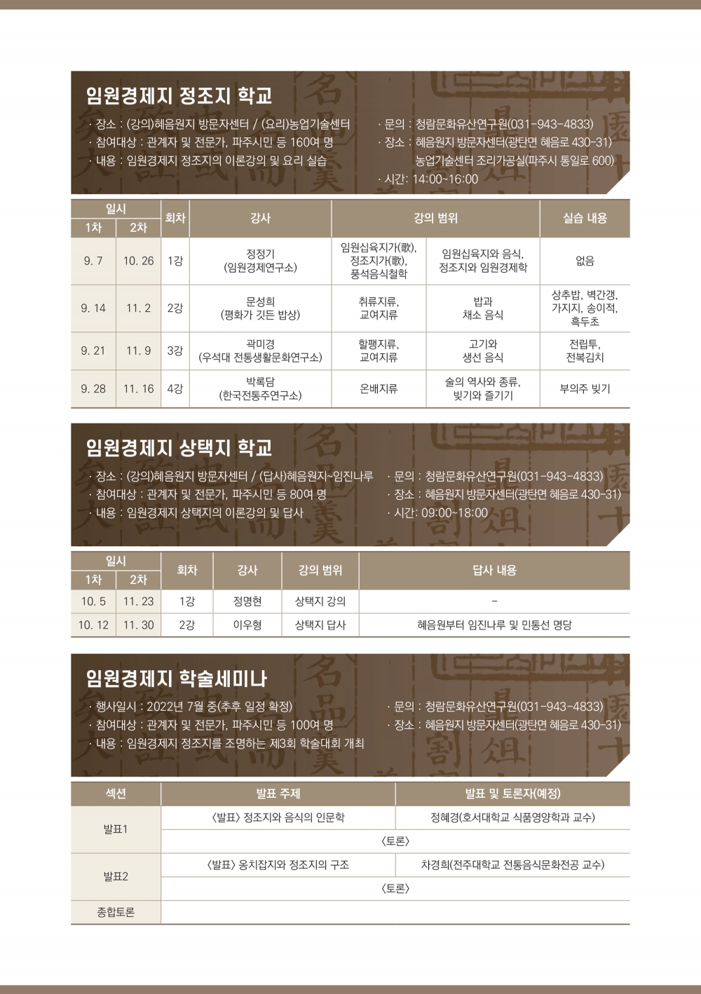 ‘임원경제지 학교‘는 ▲리딩 클래스 10강 ▲정조지 학교(요리실습) 4강 ▲상택지 학교(답사) 2강 ▲학술세미나 등으로 구성되며 회차별 20명을 모집할 예정이다.