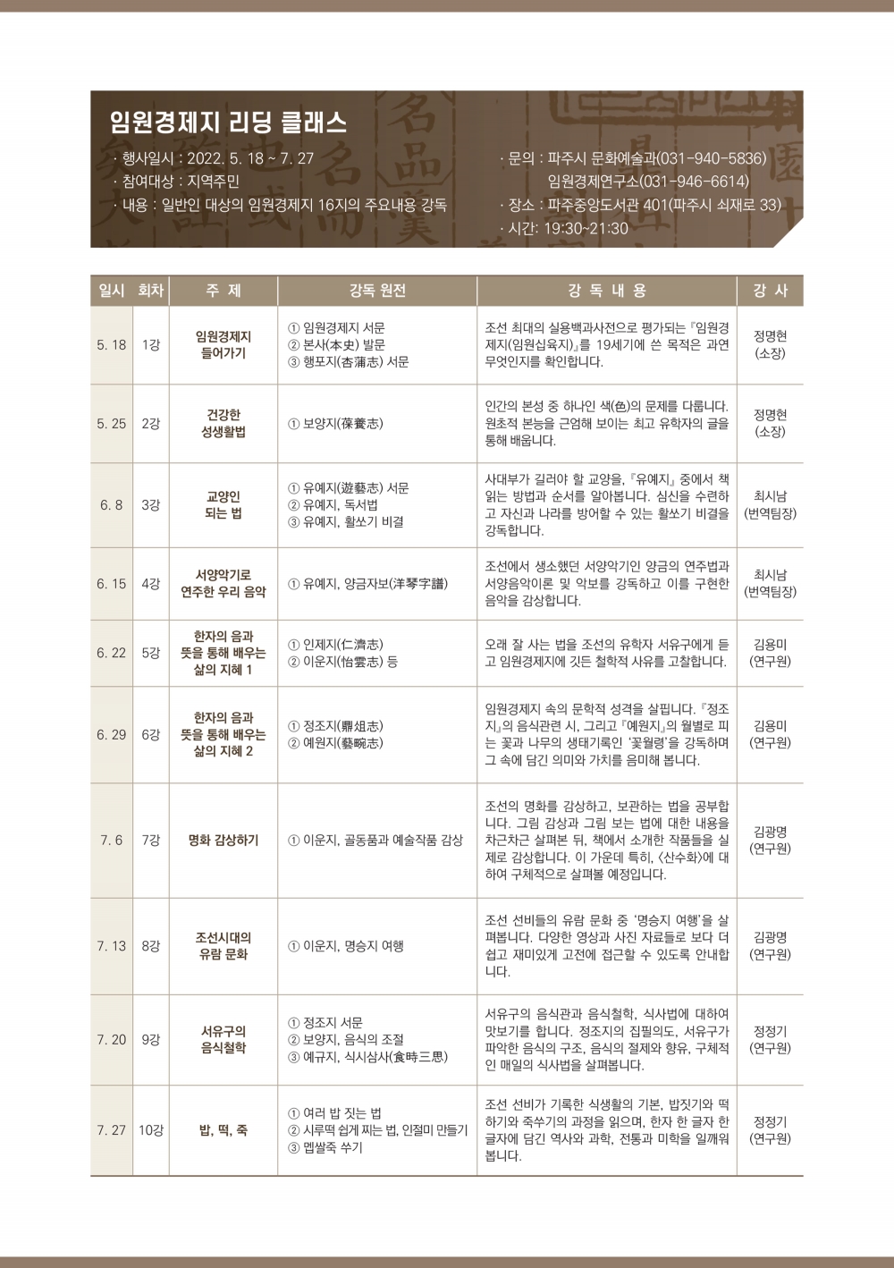 리딩 클래스는 일반인을 대상으로 임원경제지 중 일부를 발췌해 원문을 읽고 그 뜻을 밝혀 알아가는 프로그램으로 파주중앙도서관에서 진행된다.