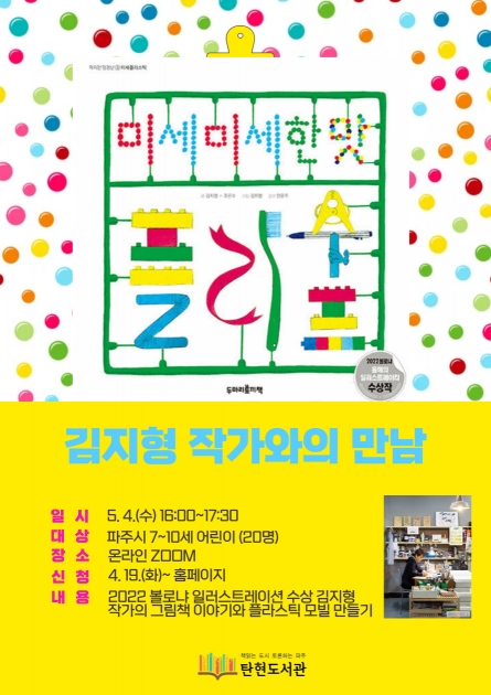 프로그램은 그림책 ‘미세미세한 맛 플라수프’ 저자 김지형 작가(2022년 볼로냐 일러스트레이션 수상)가 강사로 나서 ▲1부, 그림책 낭독, 책 만드는 과정과 작가의 작업노트 및 미공개컷 공유 ▲2부, 플라스틱 재활용 쓰레기를 이용해 ‘새활용품’ 만들기로 진행된다.