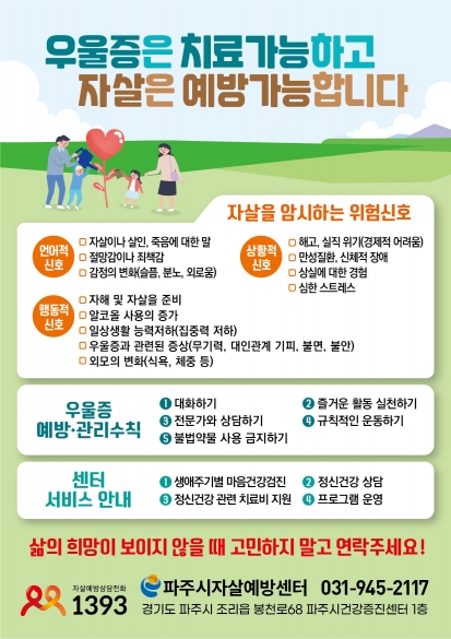 자세한 사항은 파주시자살예방센터(☎031-945-2117/ 경기도 파주시 조리읍 봉천로 68 파주건강증진센터 1층/ www.pajumind.org)로 하면 된다.
