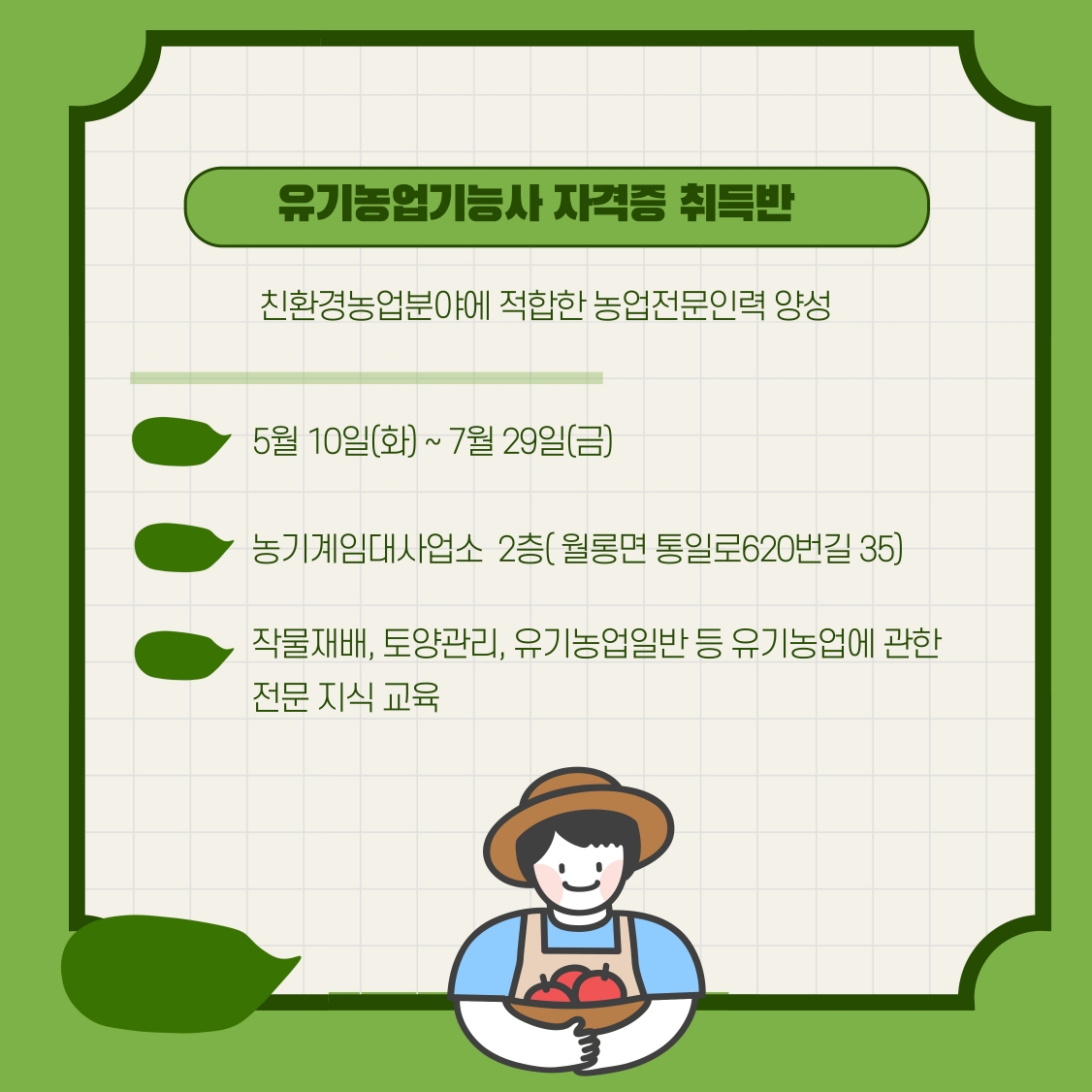 파주시는 친환경농업분야에 적합한 농업전문인력 육성을 위해 「유기농업기능사 자격증 취득반」을 운영한다고 밝혔다.