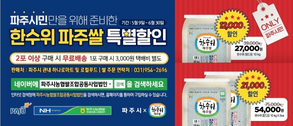 이번 행사는 전국전인 풍작으로 인한 쌀 가격 하락 및 쌀 소비량 감소 등의 어려움을 극복하고 파주쌀의 지역 내 소비를 촉진하기 위하여 추진되는 행사로, 행사기간 동안 상등급 이상의 고품질 한수위 파주쌀(품종 참드림) 10kg을 12,000원 할인하여 27,000원에 판매한다.