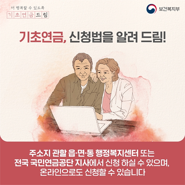 기초연금은 만 65세가 되는 어르신의 경우 생일이 속한 달의 한 달 전부터 주소지 관할 읍·면·동 행정복지센터 또는 가까운 국민연금공단을 방문해 신청할 수 있으며, 거동이 불편할 경우 국민연금공단 콜센터 1355로 ‘찾아뵈는 서비스’를 신청하면 집에서도 기초연금 신청이 가능하다.