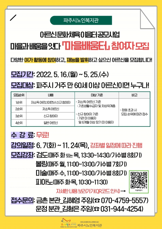 파주시 관내 거주 만 60세 이상 어르신이면 누구나 신청이 가능하고, 수강료는 무료이다. 각 프로그램별 모집 인원 및 문의사항은 파주시노인복지관( 070-4759-5557, 031-944-4254)으로 문의하면 된다.