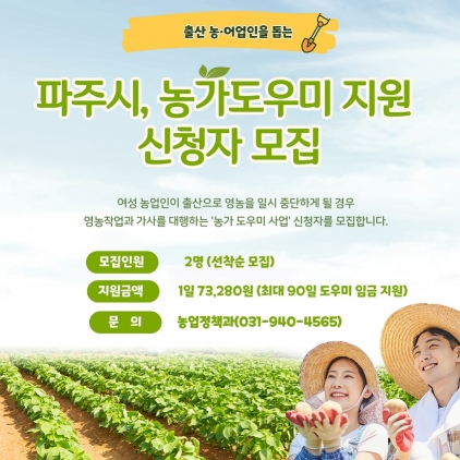 파주시, 출산 농·어업인을 돕는 농가도우미 지원 신청자 모집