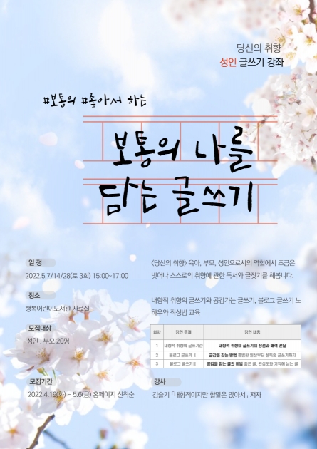 이번 강좌는 성인 20명을 대상으로 「내향적이지만 할말은 많아서」 의 저자인 김슬기 작가가 자기 취향에 관한 독서, 내향적 취향의 글쓰기, 공감가는 글쓰기 등 다양한 글쓰기 작성법을 교육한다.