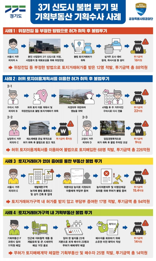 김영수 경기도 공정특별사법경찰단장은 18일 경기도청에서 기자회견을 열고 “올해 3월부터 3기 신도시 토지거래허가구역인 고양시와 남양주시 일대를 대상으로 무허가, 위장전입, 목적 외 사용 등 불법행위에 대해 기획수사를 실시해 불법 투기자 97명과 과천시 소재 임야에 대해 토지거래허가를 받지 않고 지분쪼개기 방법으로 매매하던 25명 등 불법 투기자 총 122명을 적발했다”고 밝혔다.