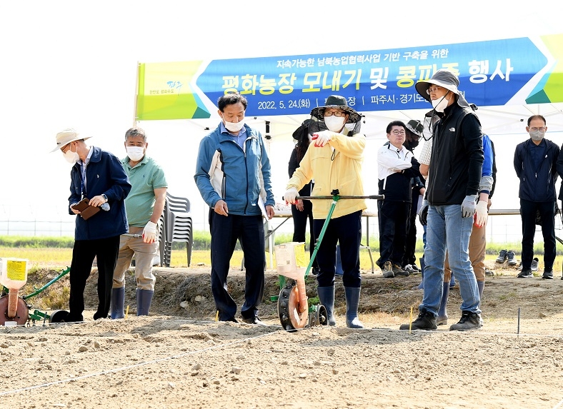 파주시는 남북농업협력사업 일환으로 시험재배 작물의 북한지역에서의 적응성 확인을 위해 24일 장단면 거곡리 평화농장에서 시험재배 작물 모내기 및 콩파종 행사를 실시했다고 밝혔다.