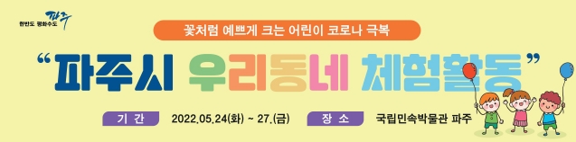 파주시는 초등학교 3학년 등 저학년 어린이 80명을 대상으로 24일부터 오는 27일까지 국립민속 박물관 등 문화체험시설을 체험하는 ‘우리동네 체험활동’을 추진한다고 밝혔다.