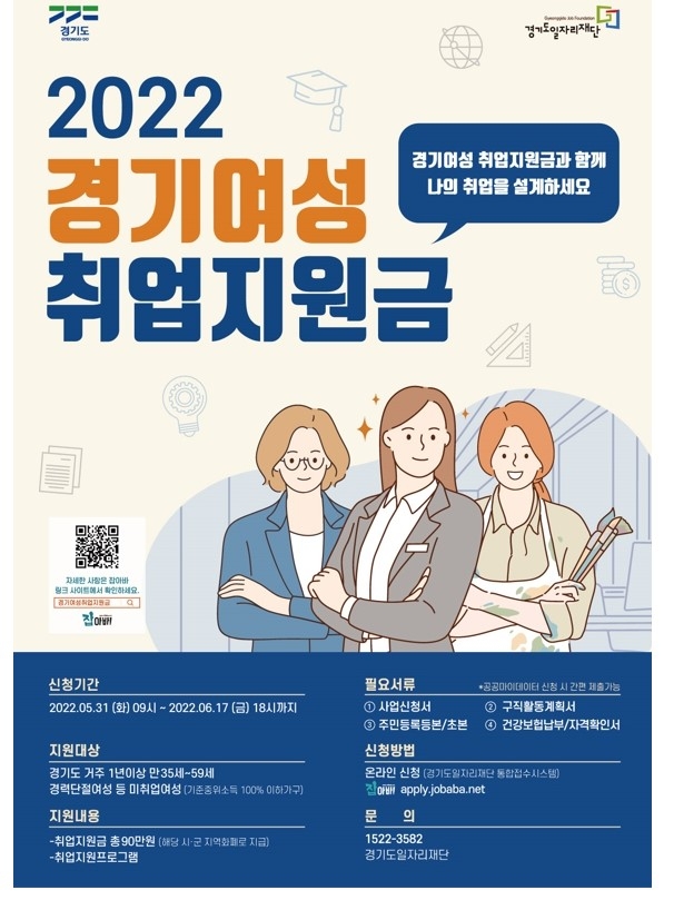 지원받길 희망하는 구직여성은 오는 6월 17일까지 경기도일자리재단 통합접수시스템 잡아바(apply.jobaba.net)에서 온라인으로 신청하면 된다.