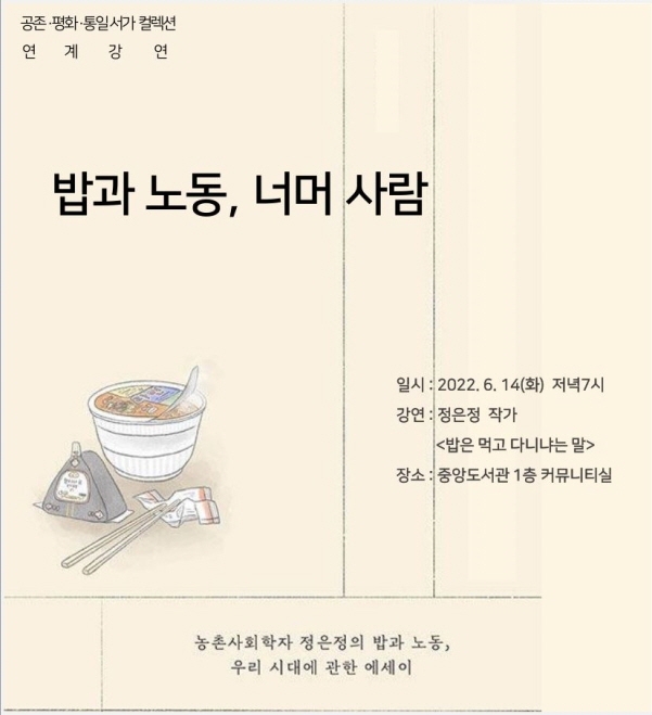 이번 강좌는 ‘3층 자료실의 ’공존·평화·통일‘ 서가의 ’공존‘ 연계 강연으로, 우리가 일상에서 먹고 사는 일의 구체성과 먹거리와 관련된 현장에서 일하는 사람들의 목소리를 전하며, 밥과 노동, 사람과 세상에 대해 생각해 보는 시간으로 진행된다.