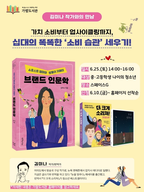 작가이자 번역가인 김미나 작가는 이번 작가와의 만남을 통해 ‘내가 추구하는 가치에 더 가까운 물건’을 찾을 수 있도록 나만의 소비 기준을 세우는 데 길잡이 역할을 하고자 한다.