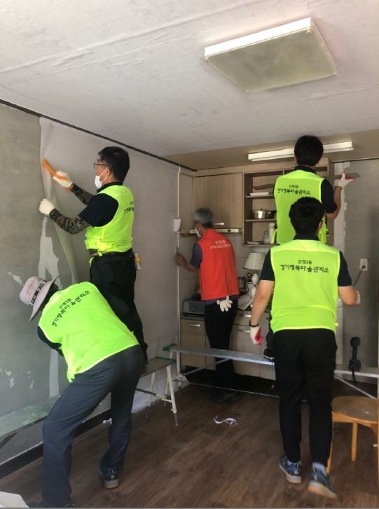대상 컨테이너 주택은 벽면과 장판이 습기로 인해 곰팡이가 퍼져 주거환경개선이 시급한 상태였으며, 이에 맞춤형복지팀, 지역사회보장협의체, 행복마을 관리소 직원 총 21명이 참여해 노후된 도배와 장판 교체 작업 등 주거환경개선 봉사를 펼쳤다.