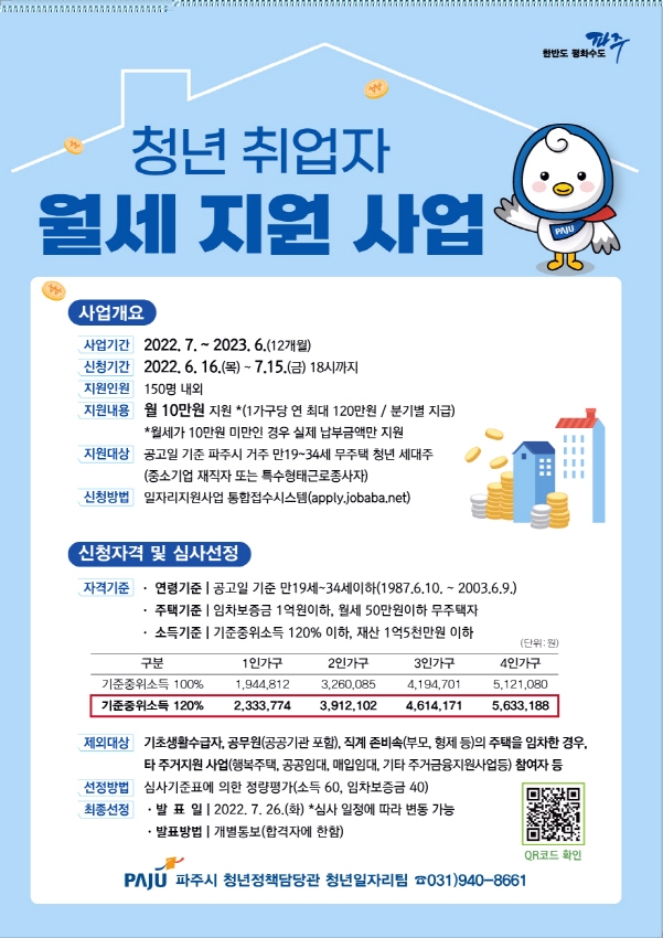 파주시는 6월 16일부터 7월 15일까지 청년 취업자의 생활 안정을 위한 주거비 지원 사업 하반기 참여자 150명을 모집한다고 밝혔다.