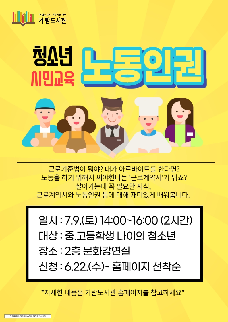 파주시 가람도서관은 오는 7월 9일 가람도서관 문화강연실에서 ‘아는 만큼 도움 되는 청소년 노동인권’을 주제로 청소년 시민교육을 운영한다고 밝혔다.