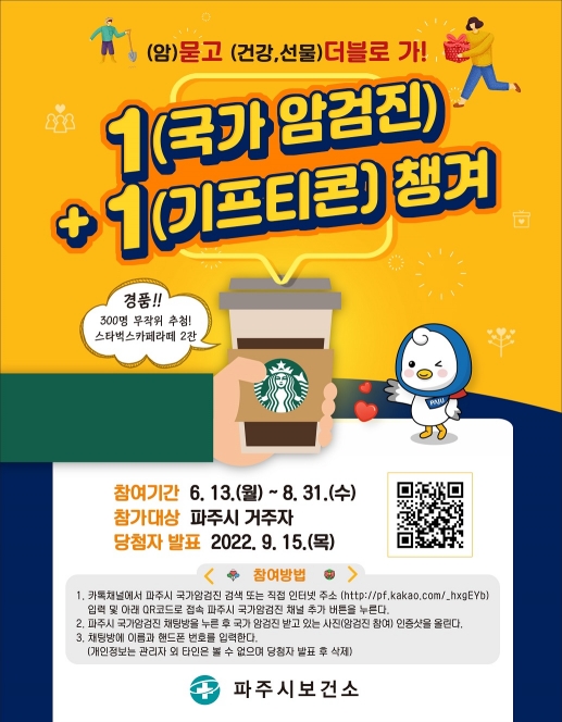 시 거주자를 대상으로 올해 국가 암 검진 대상자인 짝수년도 출생자가 이벤트 기간 내 국가암검진을 받고 파주시 국가암검진 카카오톡 채널 또는 QR코드로 접속해 참여 인증샷을 올리면, 추첨을 통해 9월 15일 300명에게 커피음료 기프티콘을 제공한다.
