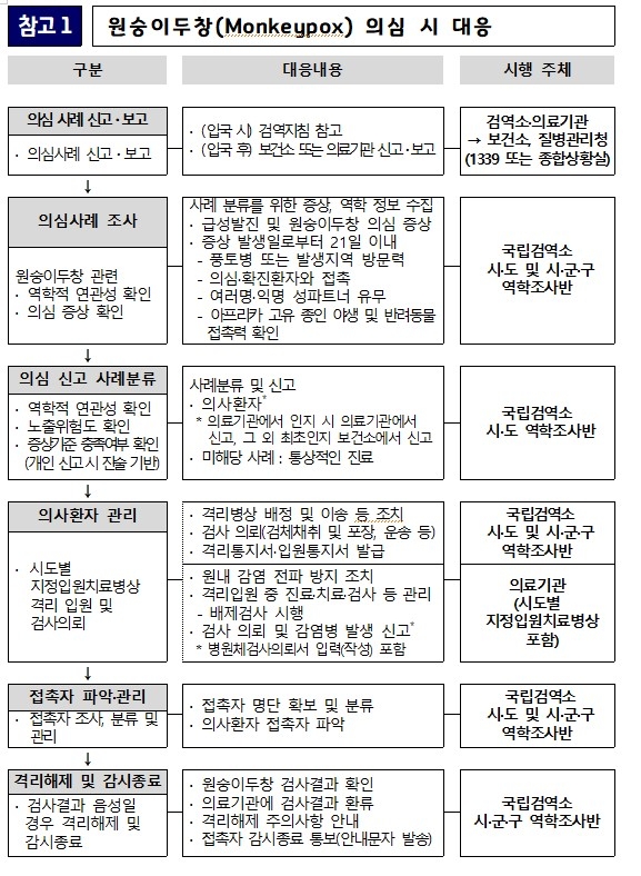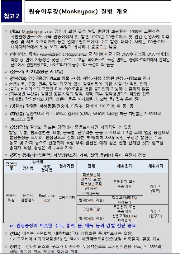 그러면서 “원숭이두창 발생 국가를 방문 또는 여행한 경우 손 씻기, 마스크 착용 등 개인위생 수칙을 준수하고 귀국 후 21일 이내 증상 발생 시 질병관리청 콜센터(1339)로 상담해달라”고 당부했다.