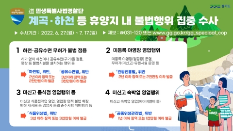 경기도 특별사법경찰단이 6월 27일부터 7월 17일까지 여름휴가철을 맞아 도내 하천‧계곡 등 유명 휴양지의 불법행위를 집중 수사한다.