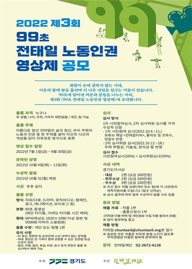 경기도가 2022년도 전태일 열사 추모사업의 일환으로 ‘99초 전태일 노동인권 영상제’ 등 3개 사업을 추진, 참가자(단체)를 모집한다고 27일 밝혔다.