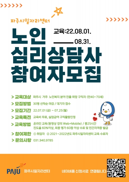 파주시,‘노인심리상담사 자격증 과정’참여자 30명 모집
