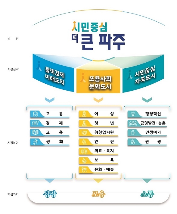 민선8기 파주시는 소통과 공감의 혁신행정으로 시민 모두의 삶에 더 가까이 다가가고자 한다. 시민의 삶이 풍성한 도시, 미래 먹거리가 풍부한 자족도시를 만들고자 함이다. 권력과 권위를 시민 앞에 내려놓고, 진정으로 시민의 눈높이에서 소통하는 파주시를 만들어 소외되는 시민 없이, 누구나 시정의 주인이 되도록 시민중심의 정책 대전환을 시작한다.