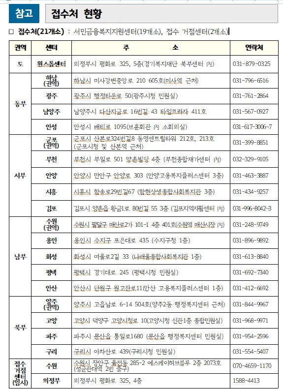 경기도가 물가 상승 등 민생 경제 위기 대응의 하나로 ‘경기 극저신용대출’ 접수를 한 달 앞당겨 7월 5일부터 조기 추진하고, 접수처인 서민금융복지센터의 임시 거점센터를 2개소(수원·의정부) 증설해 총 21개소로 운영한다.