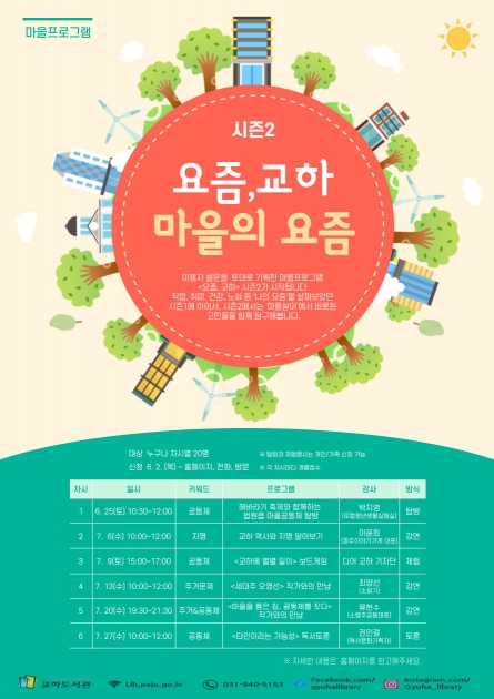파주시 교하도서관(관장 이현주)은 오는 7월 말까지 교하도서관 2층 문화강연실에서 ‘시즌2 요즘, 교하-마을의 요즘’ 프로그램을 운영한다고 밝혔다.