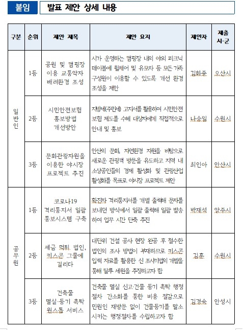 일반인 제안 1등을 차지한 오산시 김화중씨의 제안인 ‘공원 및 캠핑장 이용 교통약자 배려환경 조성’은 휠체어 이용 장애인이나 유모차 이용 영유아 등 교통약자 동반 가정에 대한 배려를 통해 공원과 캠핑장 이용의 편의를 증진한다는 점에서 높은 점수를 받았다.