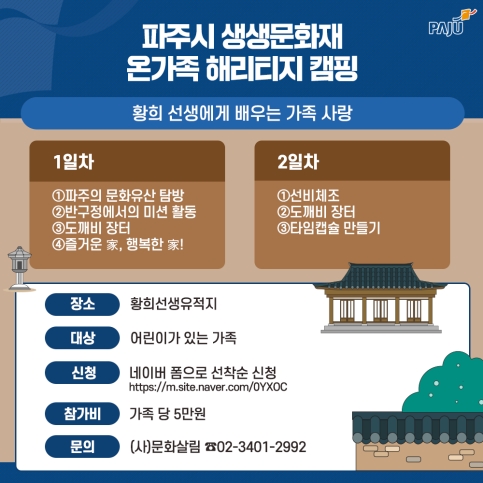 3개 사업은 ▲행아웃위드방촌 ▲파주 혜음원지, 고려를 보고 듣고 만지다 ▲율곡코드로, ‘행아웃 위드 방촌’ 사업은 황희 선생 유적지에서 ‘온가족 해리티지 캠핑’을 진행하며, 문화유산 탐방, 반구정에서의 미션활동, 도깨비장터, 가족토크쇼가 진행된다.