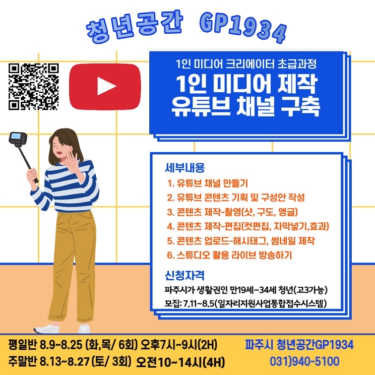 파주시는 7월 11일부터 8월 5일까지 청년공간 ‘GP1934’에서 1인 미디어 제작 초급과정 교육생 각 16명(주말반, 평일 저녁반)을 모집한다고 밝혔다.
