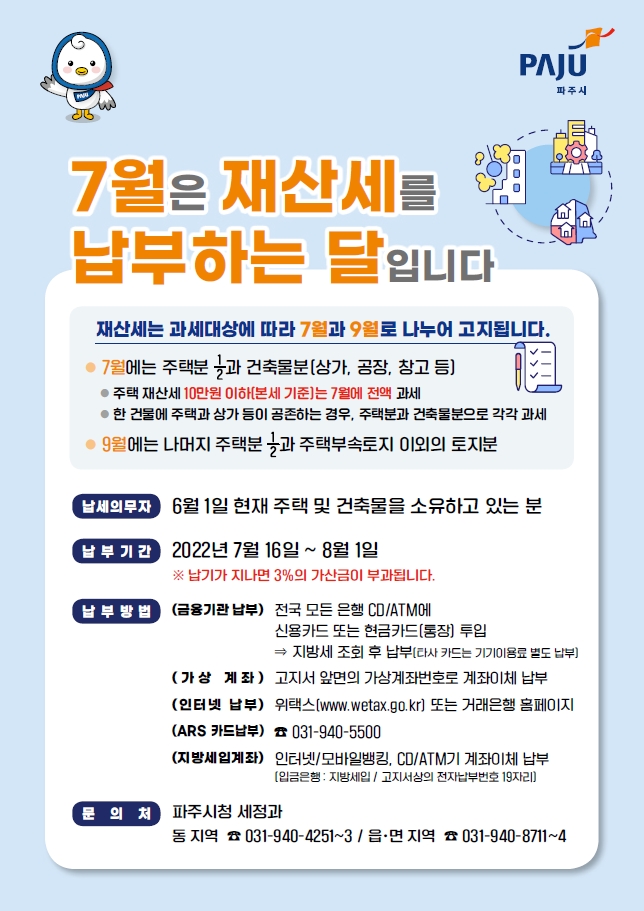 파주시(시장 김경일)는 2022년 7월 정기분 재산세 과세대상 22만5,000건에 대해 417억원을 부과, 고지했다고 밝혔다.