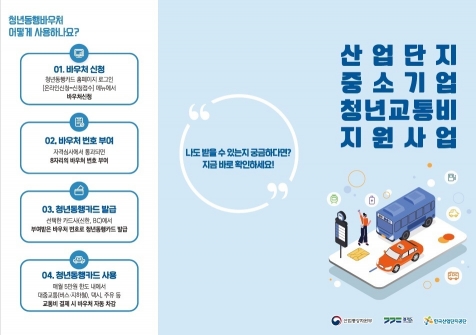 교통 여건이 열악한 산단 내 중소기업에 재직 중인 만 15~34세 청년에게 지하철, 시외·고속버스, 택시, 전기차 충전 등에 사용할 수 있는 월 5만 원의 교통비 바우처를 지원하고 있다.