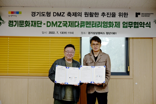 DMZ국제다큐멘터리영화제&경기문화재단 Let’s DMZ 업무협약 체결 경기도형 DMZ축제의 원활한 추진 위해 협력 13일 경기상상캠퍼스에서 협약식 진행