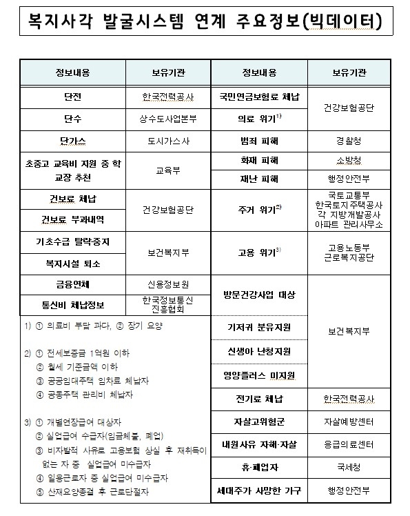 주요 내용을 보면 경기도는 우선 보건복지부가 선정한 34종 위기 징후 정보를 기반으로 한 빅데이터로 위기가구를 선제적으로 발굴할 계획이다. 34종 위기 징후 정보는 한국전력공사의 단전 가구, 신용정보원의 금융 연체 현황, 국세청의 휴‧폐업자 현황 등이다.