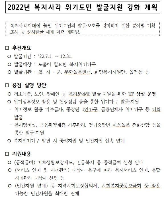 도는 시‧군이 농어촌 등 지역 현황에 맞춰 위기 징후 정보를 활용한 기획발굴을 진행하고, 위기가구를 포착할 경우 상담‧조사 후 맞춤형 지원을 할 수 있도록 했다.